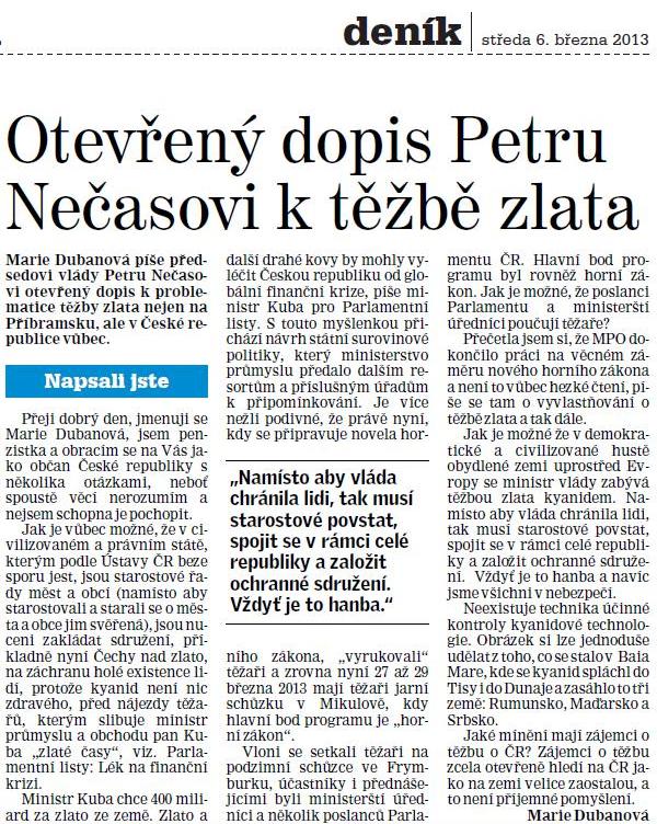 Otevřený dopis Petru Nečasovi k těžbě zlata (6. 3. 2013)